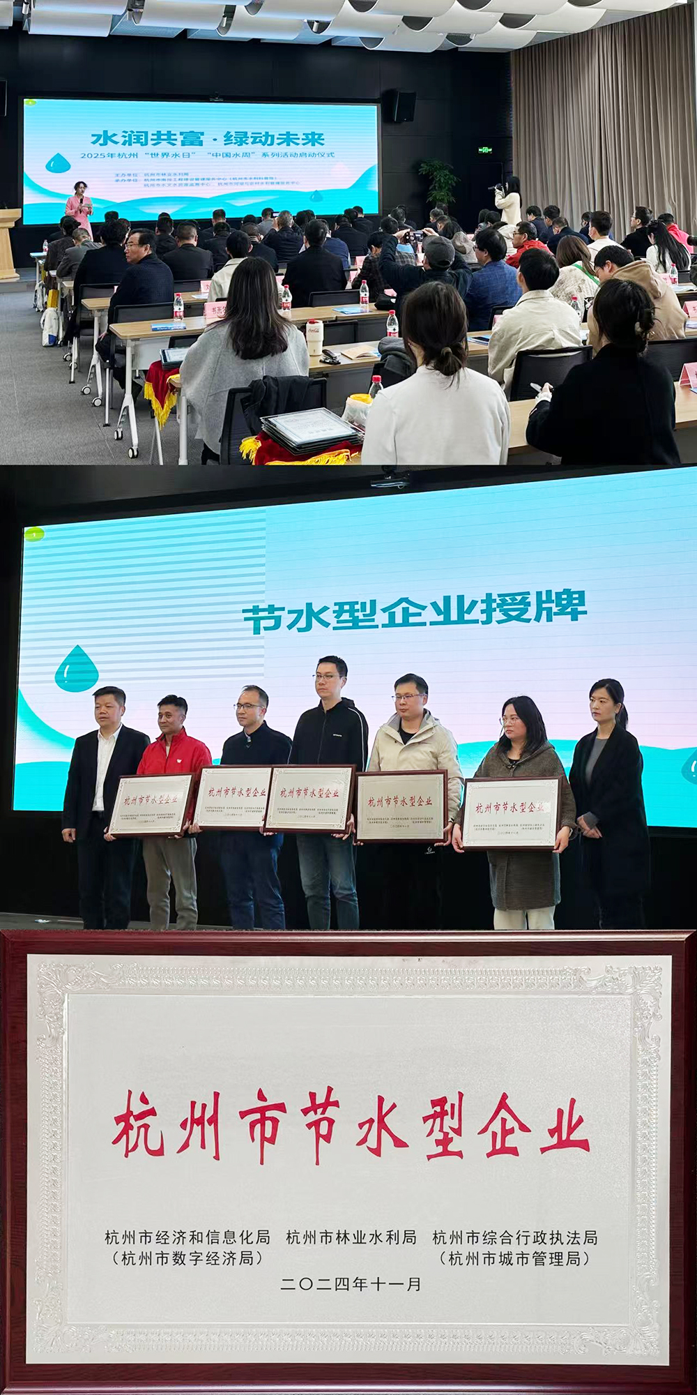 3月21日上午,由杭州市林業水利局主辦的2025年“世界水日”“中國水周”宣傳活動在市南排工程建設管理服務中心(市水利科普館)隆重召開。杭州臨江環境能源有限公司榮獲“杭州市節水型企業”,并作為“2024年杭州市十佳節水型企業”在此次活動中上臺領獎。