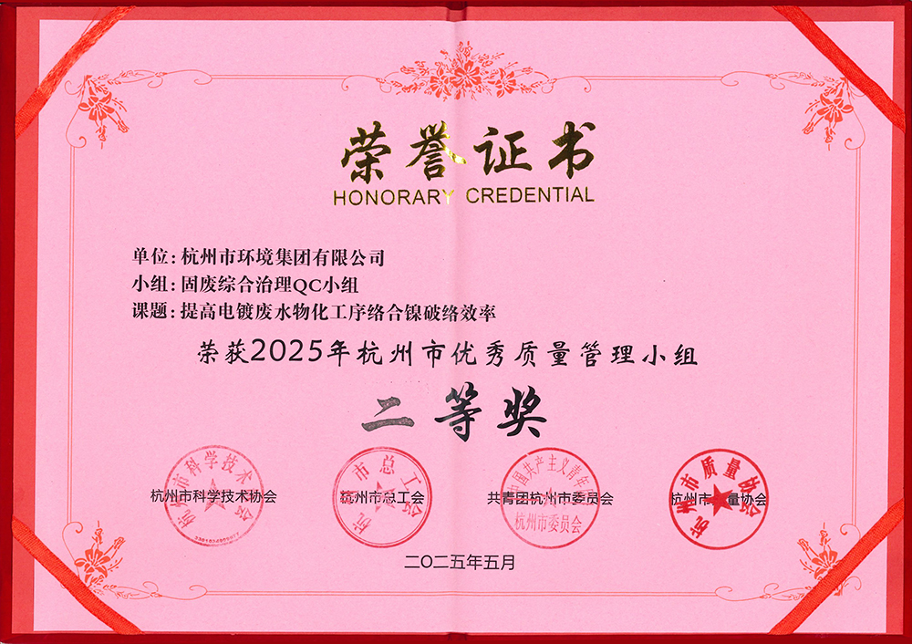 5月27日-30日,由杭州市科學技術協會、杭州市總工會、共青團杭州市委員會和杭州市質量協會聯合舉辦的2025年杭州市優秀質量管理小組成果發布會評比活動在千島湖舉行,臨江公司固廢綜合治理QC小組成果《提高電鍍廢水物化工序絡合鎳破絡率》通過現場路演、專題匯報、專家評審答辯在近400個課題組脫穎而出,榮獲2025年杭州市優秀質量管理小組二等獎。